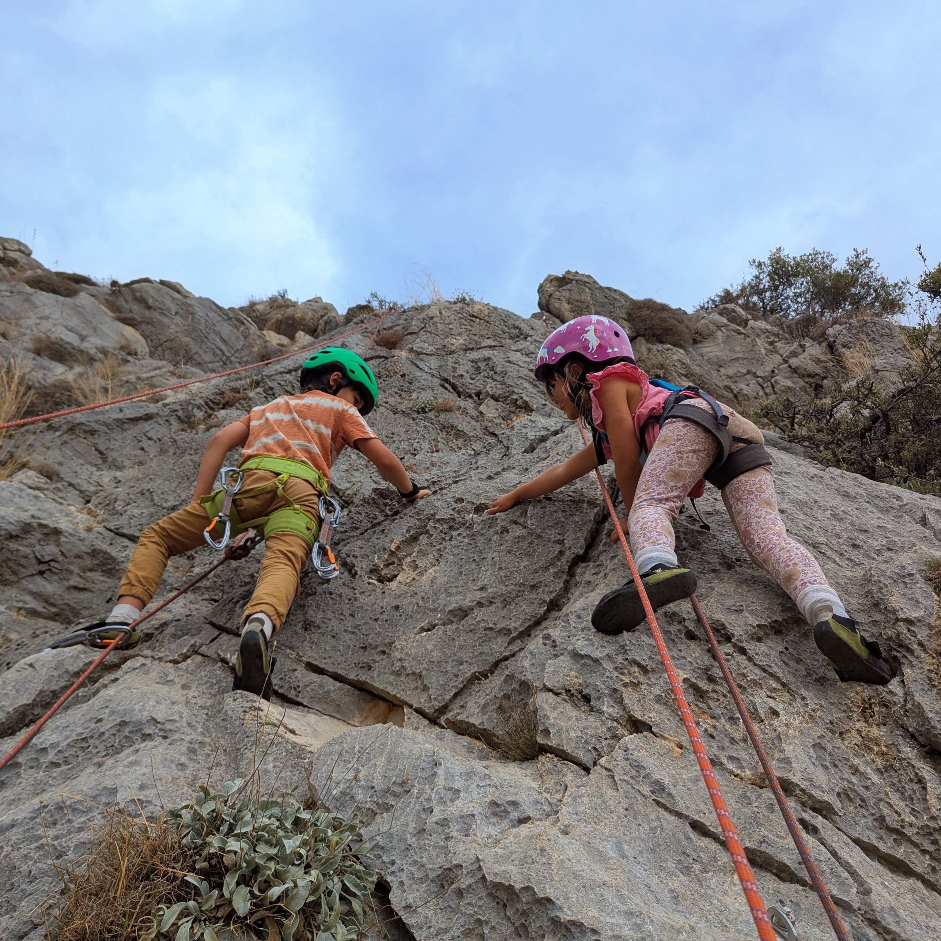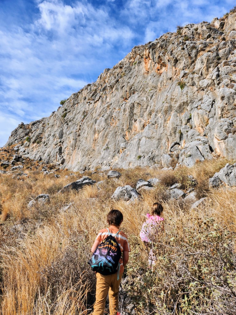 The pros of this crag were: overlooking beautiful Karathona bay, super easy access (you park on a road which looks like it was part of an abandoned development and is not populated with bee hives and sadly rubbish… perhaps houses were planned?). There are cute little easy climbs on the far end perfect for the kids to climb at the same time and technical, vert, long lines in the 5s and 6s. The cons were: it was super hot! We thought that climbing in the sun at the end of November would be fine, but it would have been worth waiting for afternoon shade (morning shady climbing can be had within the same bay at the crag Karathonas on the opposite side of the bay, or Kato Kosmos in a little shady canyon). At least we could easily cool off with a swim after!