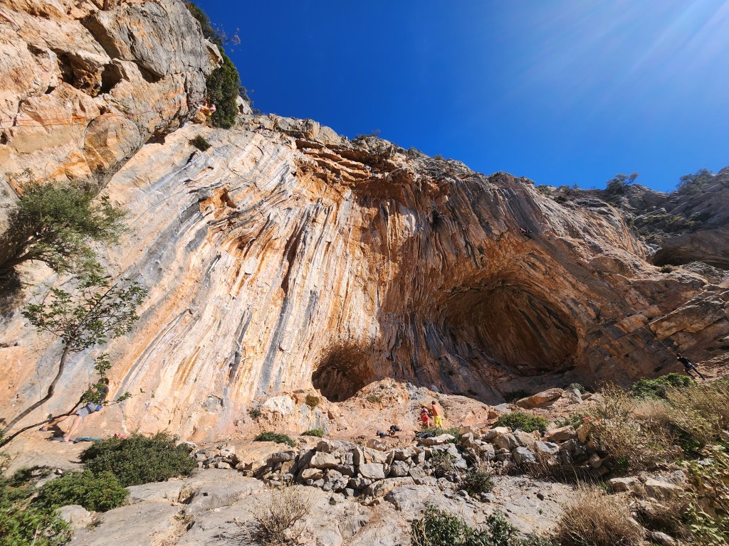 After climbing at Sabaton on the way in from the north and doing a quick recce of the extensive valley extending inland from Leonidio (see below) we settled on Twin Caves as our second crag – it is situated at the top of a spectacular switch-back, part of the main cliff-line that towers over the town and promises both hard cave-routes and slabby mid-grades on the left hand side. It was probably the busiest crag we climbed at for the whole trip but it was nice to make friends, and if we’d been staying longer, swapping stories would have been a good way to figure out which crag to explore next.
