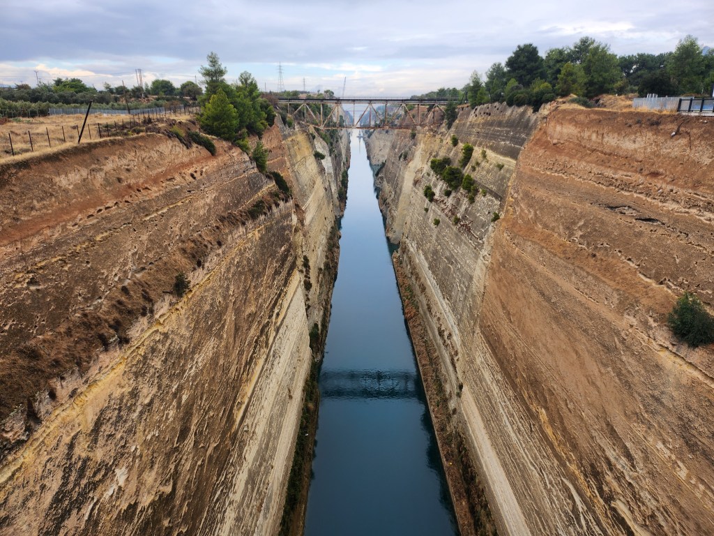 When our climbing got rained out we paid the Corinth canal a visit, viewing it from the Old Isthmus Bridge – and whilst perhaps not a must-see in itself, it is an impressive sight. The idea was first originated in the 7th century BC, not completed until 1893 and ultimately has proved challenging to operate ever since!