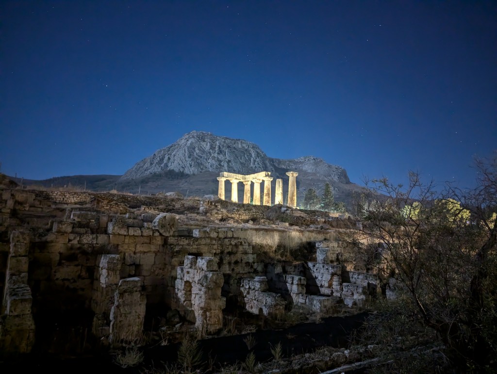 The Ancient Corinth archaeological site is very nearby. It has an impressive Temple of Apollo (especially when lit up at night) and you have almost complete free reign to explore the ruins and imagine it in its heyday.