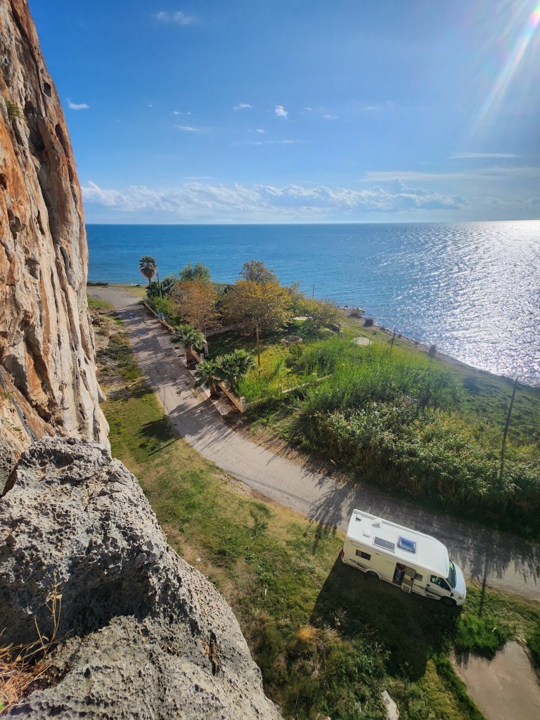 Boy are we glad we did! We only had an afternoon here, and we cherry-picked the sector which we could park right next to but this rock promises many an adventure. The mountain itself dives nose-first into the sea, it’s possible to camp right there and there are many styles to explore – from hard sport single-pitches to exciting-looking trad multis.
